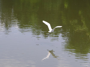 Crane flying over water