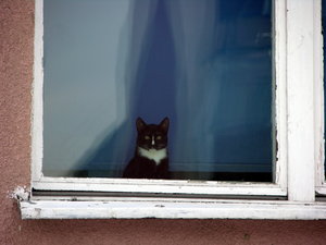 Fenster Haus Wand rot Büro Reflexion Katze Katzen Stadt Straße Tier Tiere Bord Brach Bretter Fenster abgedichtet Gebäude nagelt alt antik Farbe Glas Kirche farbiges Glas Holz Klassiker Möbel Spanisch Stühle Tabelle Dach Dächer Hütte Stroh Stroh- Architektur Häuser Zuhause Efeu