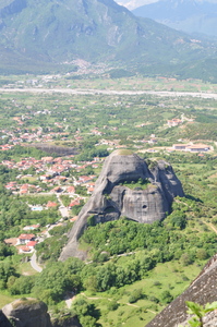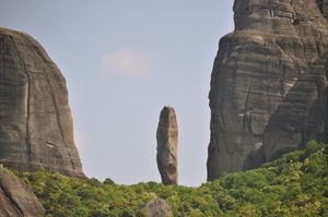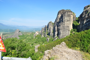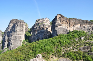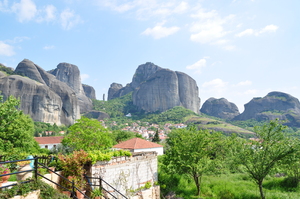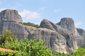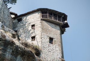 Bäume Fenster Himmel Kloster Meteor Sommer Vögel Wolken Steine alt Wand Felsen Griechenland Griechisch Landschaft Natur Rock berühmt grau