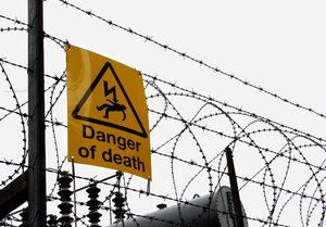 Horn Macht Nashorn Säugetier Tier diceros bicornis schwarz vertebrate.danger Beschilderung Gefahr Strom Tod Unfall Zeichen Explosion Piktogramm Sprengstoff Warnung Sicherheit Zaun Arbeit Mann Männer Transit Werktätige leer Benachrichtigung Dreieck Fluss Wasser kein Zugriff tief Landschaft Nebel Thames