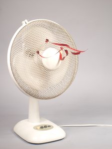 White fan with red ribbons