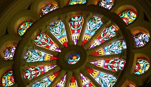 runden Glasfenster, Bunte, Designs, Fenster, Kunst aus Glas, Licht, Muster, Nabe, Rad, Rosette, Schatten, Speichen, bunt, eulenhaft, farbiges Glas, zentral