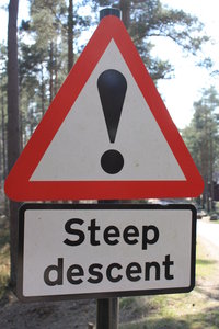 Achtung!, Abstieg, Ausruf, Dreieck, Grenze, Straße, Warnung, Zeichen, rot, steil, warnen, weiß